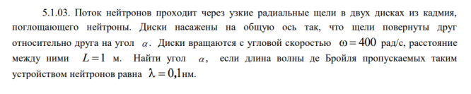 5.1.03. Поток нейтронов проходит через узкие радиальные щели в двух дисках из кадмия, поглощающего нейтроны. Диски насажены на общую ось так, что щели повернуты друг относительно друга на угол . Диски вращаются с угловой скоростью 400 рад/c, расстояние между ними L 1 м. Найти угол , если длина волны де Бройля пропускаемых таким устройством нейтронов равна 0,1 нм. .