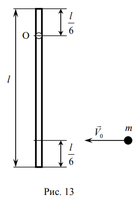 Однородный жёсткий стержень длиной l=1 м и массой M=1 кг свободно висит на горизонтальной идеально гладкой оси вращения О, как показано на рис. 13.