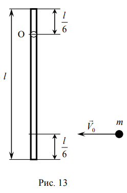 Однородный жёсткий стержень длиной l=1 м и массой M=1 кг свободно висит на горизонтальной идеально гладкой оси вращения О, как показано на рис. 13.
