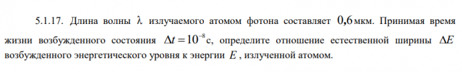 5.1.17. Длина волны излучаемого атомом фотона составляет 0,6 мкм. Принимая время жизни возбужденного состояния 8 10 t с, определите отношение естественной ширины E возбужденного энергетического уровня к энергии E , излученной атомом. .
