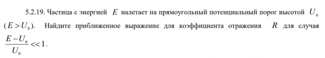 5.2.19. Частица с энергией E налетает на прямоугольный потенциальный порог высотой U0 ( E U0 ). Найдите приближенное выражение для коэффициента отражения R для случая 1 0 0 U E U . .