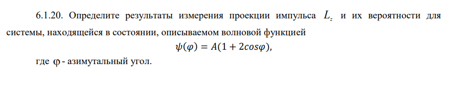 6.1.20. Определите результаты измерения проекции импульса L z и их вероятности для системы, находящейся в состоянии, описываемом волновой функцией 𝜓(𝜑) = 𝐴(1 + 2𝑐𝑜𝑠𝜑), где - азимутальный угол.