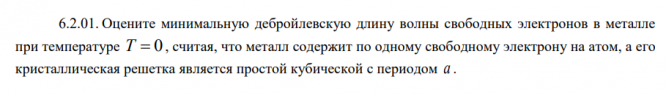 6.2.01. Оцените минимальную дебройлевскую длину волны свободных электронов в металле при температуре T 0 , считая, что металл содержит по одному свободному электрону на атом, а его кристаллическая решетка является простой кубической с периодом a.