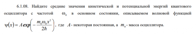6.1.08. Найдите средние значения кинетической и потенциальной энергий квантового осциллятора с частотой 0 в основном состоянии, описываемом волновой функцией 2 2 0 0 m x x Aexp , где A- некоторая постоянная, а m0 - масса осциллятора. .