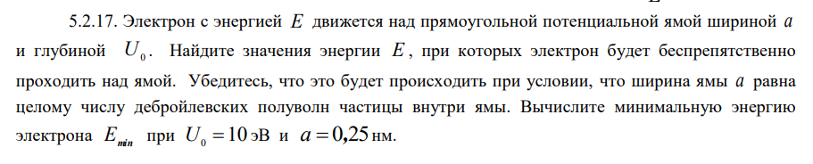 5.2.17. Электрон с энергией E движется над прямоугольной потенциальной ямой шириной a и глубиной U0 . Найдите значения энергии E , при которых электрон будет беспрепятственно проходить над ямой. Убедитесь, что это будет происходить при условии, что ширина ямы a равна целому числу дебройлевских полуволн частицы внутри ямы. Вычислите минимальную энергию электрона Emin при U0 10 эВ и a 0,25 нм..