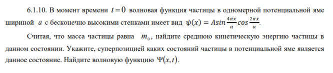 6.1.10. В момент времени t 0 волновая функция частицы в одномерной потенциальной яме шириной a с бесконечно высокими стенками имеет вид 𝜓(𝑥) = 𝐴𝑠𝑖𝑛 4𝜋𝑥 𝑎 𝑐𝑜𝑠 2𝜋𝑥 𝑎 . Считая, что масса частицы равна m0 , найдите среднюю кинетическую энергию частицы в данном состоянии. Укажите, суперпозицией каких состояний частицы в потенциальной яме является данное состояние. Найдите волновую функцию x,t. .