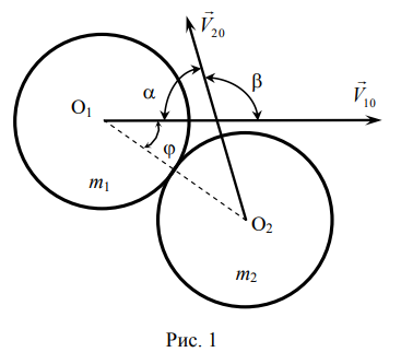 Две гладкие частицы сферической формы с массами m1 и m2, движущиеся со скоростями V10 и V20 , сталкиваются под углом , как указано на рис.1. Расстояние до места встречи и скорости частиц соответствуют условиям соударения (отсутствию промаха).