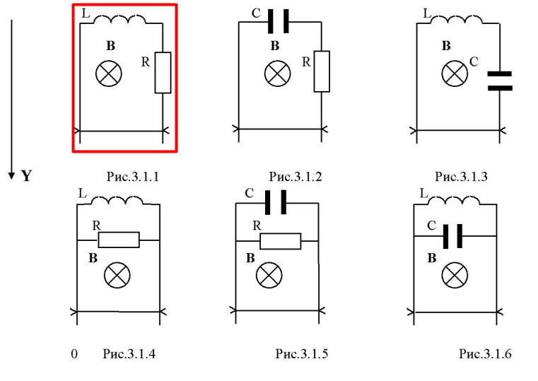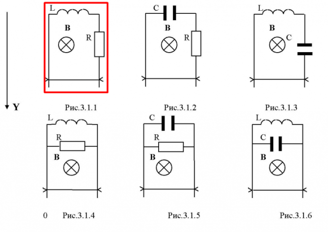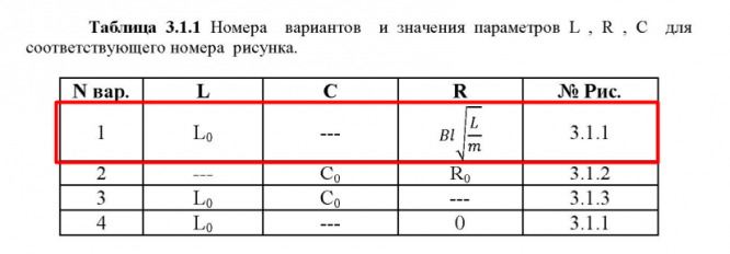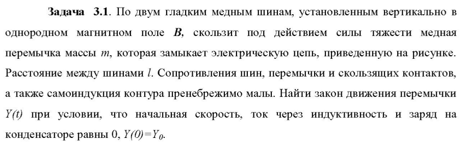 Задача 3.1. По двум гладким медным шинам, установленным вертикально в однородном магнитном поле B скользит под действием силы тяжести медная перемычка массы m, которая замыкает электрическую цепь, приведенную на рисунке. Расстояние между шинами l. Сопротивления шин, перемычки и скользящих контактов, а также самоиндукция контура пренебрежимо малы. Найти закон движения перемычки Y(t) при условии, что начальная скорость, ток через индуктивность и заряд на конденсаторе равны 0, Y(0)=Y0. Таблица 3.1.1 Номера вариантов и значения параметров L , R , C для соответствующего номера рисунка.
