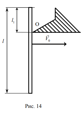 Однородный жёсткий вертикальный стержень длиной l=1 м и М=1 кг, движущийся поступательно в плоскости рисунка с постоянной горизонтальной скоростью V0, налетает на край массивной преграды (рис. 14). После удара стержень вращается вокруг оси O перпендикулярной плоскости рисунка. Ось вращения стержня совпадает с ребром преграды и проходит через точку контакта стержня с преградой, так что точка контакта лежит выше центра тяжести стержня (рис. 14). Потерями механической энергии при вращении стержня после удара пренебречь.