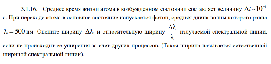 5.1.16. Среднее время жизни атома в возбужденном состоянии составляет величину t ~ 8 10 с. При переходе атома в основное состояние испускается фотон, средняя длина волны которого равна 500 нм. Оцените ширину и относительную ширину излучаемой спектральной линии, если не происходит ее уширения за счет других процессов. (Такая ширина называется естественной шириной спектральной линии). .