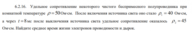 6.2.16. Удельное сопротивление некоторого чистого беспримесного полупроводника при комнатной температуре 50 Ом∙см. После включения источника света оно стало 1 40 Ом∙см, а через t 8 мс после выключения источника света удельное сопротивление оказалось 2 45 Ом∙см. Найдите среднее время жизни электронов проводимости и дырок. .