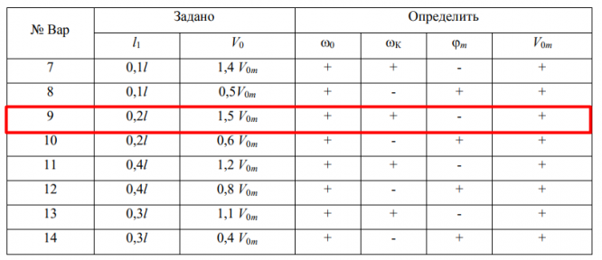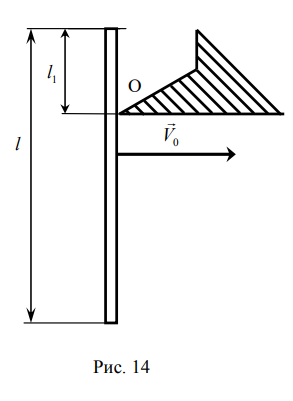 Однородный жёсткий вертикальный стержень длиной l=1 м и М=1 кг, движущийся поступательно в плоскости рисунка с постоянной горизонтальной скоростью V0, налетает на край массивной преграды (рис. 14). После удара стержень вращается вокруг оси O перпендикулярной плоскости рисунка. Ось вращения стержня совпадает с ребром преграды и проходит через точку контакта стержня с преградой, так что точка контакта лежит выше центра тяжести стержня (рис. 14). Потерями механической энергии при вращении стержня после удара пренебречь.