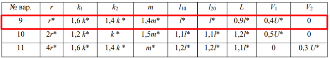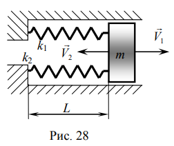 Каждая колебательная система (КС), представленная на рис. 28, 29, 30, 31, состоит из шайбы массой m и двух упругих пружин, имеющих жесткости k1 и k2 . Движение КС происходит в окружающей среде с малыми вязкими свойствами (малым коэффициентом сопротивления r). На рис. 28, 30 шайба колеблется под действием пружин, соединенных параллельно, а на рис. 29, 31 колебания происходят под действием пружин, соединенных последовательно. Массой пружин можно пренебречь. На рис. 28, 29 КС имеет горизонтальное расположение, а на рис. 30, 31 вертикальное расположение в поле силы тяжести. Длины 1-ой и 2-ой пружин в недеформированных состояниях равны l10 и l20. На рис.28, 30 L - длина каждой пружины в деформированном состоянии при t=0. На рис.29, 31 L - общая длина двух пружин в деформированном состоянии при t=0. Возможные векторы начальной скорости шайбы равны V1 , V2 . Шайбу, находящуюся в положении равновесия, смещают до расстояния L, а затем импульсом придают ей в начальный момент времени t=0 скорость V1 или V2 , в соответствии с заданием (см. таблицы № 10 - 13). В результате КС приходит в колебательное движение.
