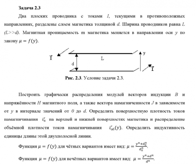 Значения параметров d варианта Два плоских проводника с токами I, текущими в противоположных направлениях, разделены слоем магнетика толщиной d. Ширина проводников равна L (L>>d). Магнитная проницаемость  магнетика меняется в направлении оси y по графически распределения модулей векторов индукции B и напряжённости H магнитного поля, а также вектора намагниченности J в зависимости от y в интервале значений от 0 до d. Определить поверхностную плотность токов намагничивания i\'п на верхней и нижней поверхностях магнетика и распределение объёмной плотности токов намагничивания i\'об(y). Определить индуктивность единицы длины этой двухполосной линии. =f(y) для чётных вариантов имеет вид: =(yn +d0 n )/d0 n =f(y) для нечётных вариантов имеет вид: =(yn +dn )/d Таблица 2.3.