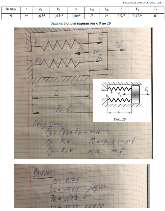 Каждая колебательная система (КС), представленная на рис. 28, 29, 30, 31, состоит из шайбы массой m и двух упругих пружин, имеющих жесткости k1 и k2 . Движение КС происходит в окружающей среде с малыми вязкими свойствами (малым коэффициентом сопротивления r). На рис. 28, 30 шайба колеблется под действием пружин, соединенных параллельно, а на рис. 29, 31 колебания происходят под действием пружин, соединенных последовательно.