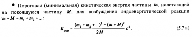 - Релятивистская частица с массой m в результате столкновения с покоившейся частицей массы M возбуждает реакцию рождения новых частиц: m + M → m1 + m2 + …, где справа записаны массы возникших частиц. Воспользовавшись инвариантностью величины E2 - p2c2, показать, что пороговая кинетическая энергия частицы m для этой реакции определяется формулой (5.7 а).