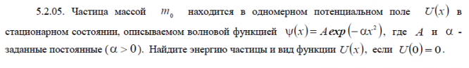5.2.05. Частица массой 0 m находится в одномерном потенциальном поле Ux в стационарном состоянии, описываемом волновой функцией 2 x Aexp x , где A и - заданные постоянные ( 0). Найдите энергию частицы и вид функции Ux, если U0 0..