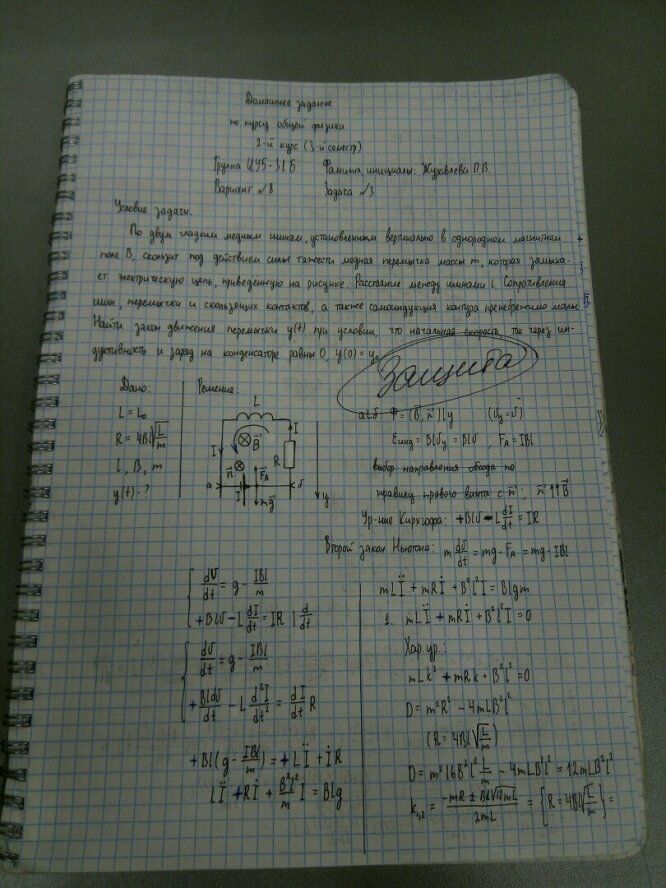 3 семестр, вариант 8, дз по физике №3 про медную перемычку, скользящую по гладким медным шинам, проверено и подписано преподавателем (Корогодина :) )