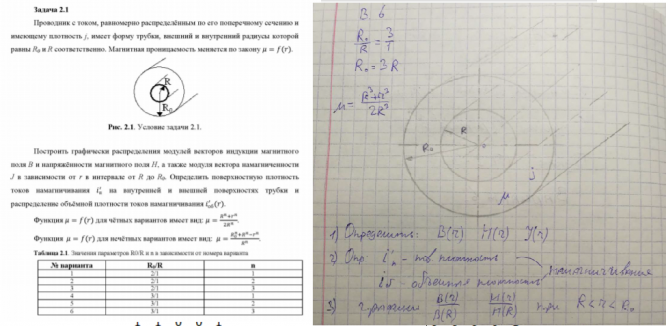 Проводник с током, равномерно распределенным по его поперечному сечению и имеющему плотность /. имеет форму трубки и внутренний радиусы которой равны Ro и R соответственно, Магнитная проницаемость меняется по закону и-f (r). Построить графически распределения модулей векторов индукции магнитного поля В и напряжённости магнитного поля Н. а также модуля вектора намагниченности Jв зависимости от г в интервале от К до Ro Определить поверхностную плотность токов намагничивания 14 на внутренней и внешней поверхностях трубки и распределение объёмной плотности токов намагничивания