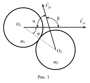 Две гладкие частицы сферической формы с массами m1 и m2, движущиеся со скоростями V10 и V20 , сталкиваются под углом , как указано на рис.1. Расстояние до места встречи и скорости частиц соответствуют условиям соударения (отсутствию промаха).