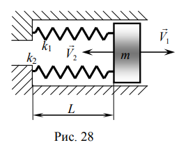 Каждая колебательная система (КС), представленная на рис. 28, 29, 30, 31, состоит из шайбы массой m и двух упругих пружин, имеющих жесткости k1 и k2 . Движение КС происходит в окружающей среде с малыми вязкими свойствами (малым коэффициентом сопротивления r). На рис. 28, 30 шайба колеблется под действием пружин, соединенных параллельно, а на рис. 29, 31 колебания происходят под действием пружин, соединенных последовательно. Массой пружин можно пренебречь. На рис. 28, 29 КС имеет горизонтальное расположение, а на рис. 30, 31 вертикальное расположение в поле силы тяжести. Длины 1-ой и 2-ой пружин в недеформированных состояниях равны l10 и l20. На рис.28, 30 L - длина каждой пружины в деформированном состоянии при t=0. На рис.29, 31 L - общая длина двух пружин в деформированном состоянии при t=0. Возможные векторы начальной скорости шайбы равны V1 , V2 . Шайбу, находящуюся в положении равновесия, смещают до расстояния L, а затем импульсом придают ей в начальный момент времени t=0 скорость V1 или V2 , в соответствии с заданием (см. таблицы № 10 - 13). В результате КС приходит в колебательное движение.