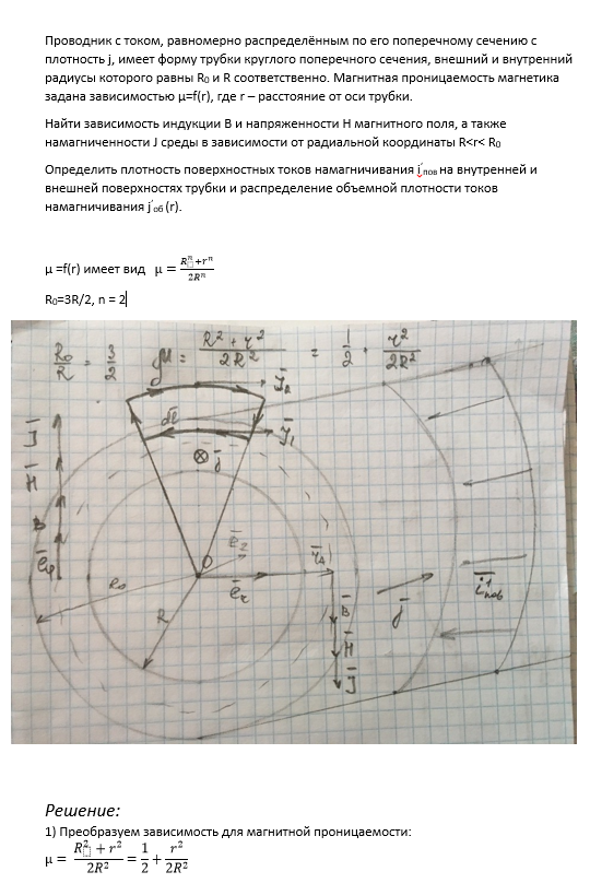 Проводник с током, равномерно распределённым по его поперечному сечению с плотность j, имеет форму трубки круглого поперечного сечения, внешний и внутренний радиусы которого равны R0 и R соответственно. Магнитная проницаемость магнетика задана зависимостью µ=f(r), где r – расстояние от оси трубки.