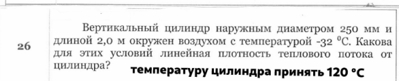 Вертикальный цилиндр наружным диаметром 250 мм и длиной 2.0 м окружён воздухом с температурой −32 ∘ C. Какова для этих условий линейная плотность теплового потока от цилиндра? Наружную температуру цилиндра принять ∘120 C