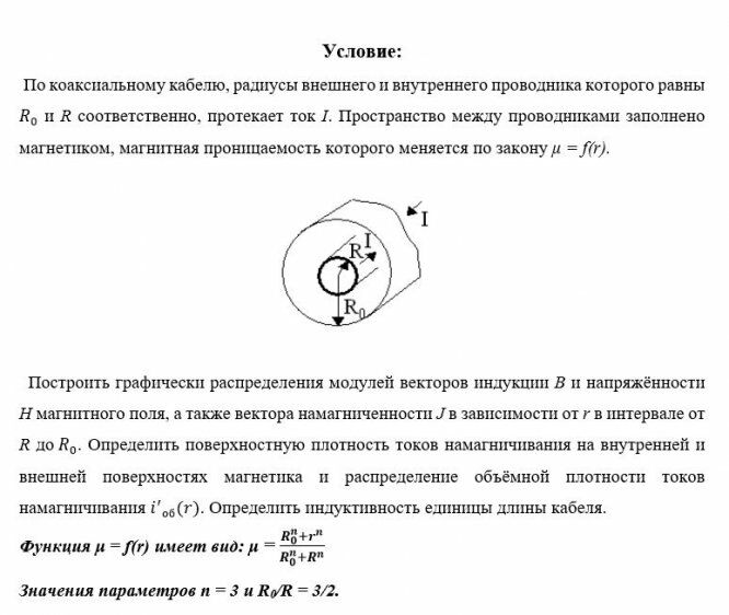 Построить графически распределения модулей векторов индукции B и напряжённости H магнитного поля, а также вектора намагниченности J в зависимости от r в интервале от R до . Определить поверхностную плотность токов намагничивания на внутренней и внешней поверхностях магнетика и распределение объёмной плотности токов намагничивания . Определить индуктивность единицы длины кабеля.