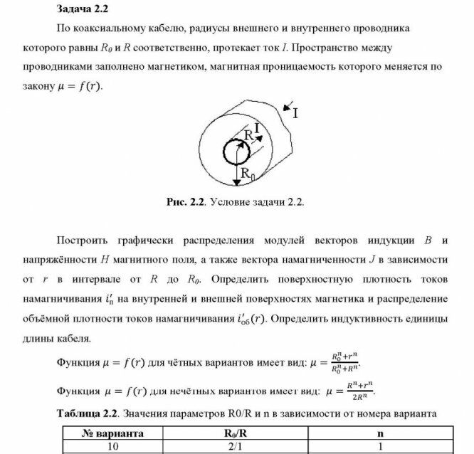 Построить графически распределения модулей векторов индукции B и напряжённости H магнитного поля, а также вектора намагниченности J в зависимости от r в интервале от R до . Определить поверхностную плотность токов намагничивания на внутренней и внешней поверхностях магнетика и распределение объёмной плотности токов намагничивания . Определить индуктивность единицы длины кабеля.