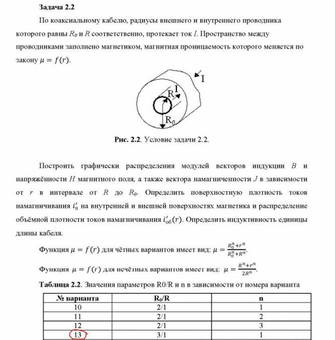 . Определить поверхностную плотность токов намагничивания на внутренней и внешней поверхностях магнетика и распределение объёмной плотности токов намагничивания . Определить индуктивность единицы длины кабеля.