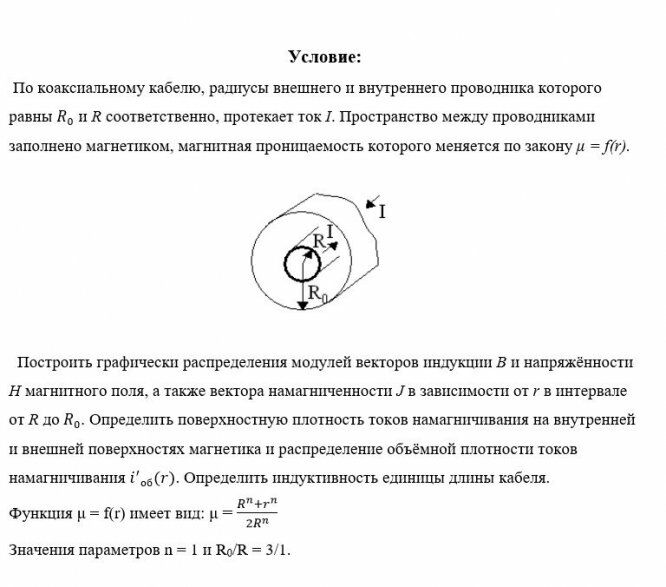 По коаксиальному кабелю, радиусы внешнего и внутреннего проводника которого равны и R соответственно, протекает ток I. Пространство между проводниками заполнено магнетиком, магнитная проницаемость которого меняется по закону μ = f(r).