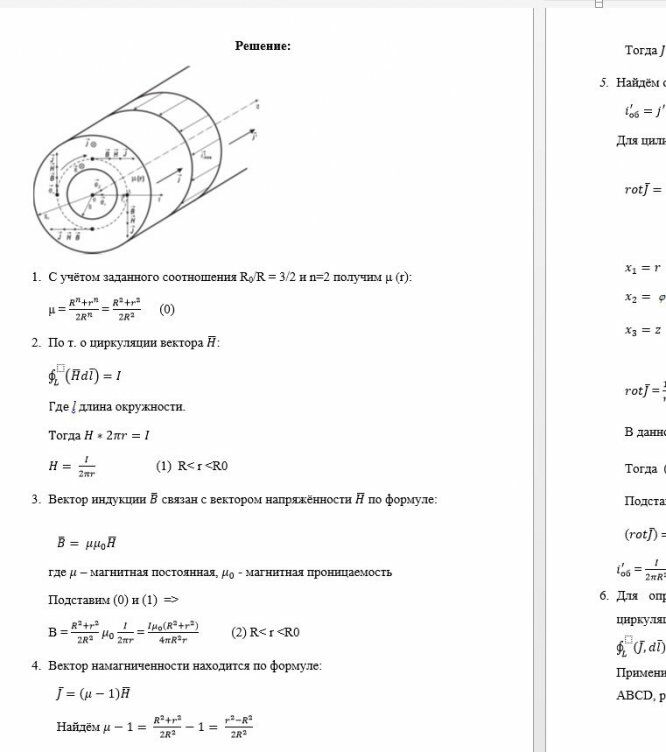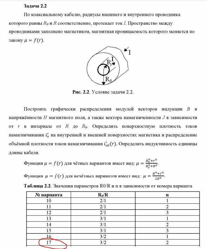 Построить графически распределения модулей векторов индукции B и напряжённости H магнитного поля, а также вектора намагниченности J в зависимости от r в интервале от R до . Определить поверхностную плотность токов намагничивания на внутренней и внешней поверхностях магнетика и распределение объёмной плотности токов намагничивания . Определить индуктивность единицы длины кабеля.