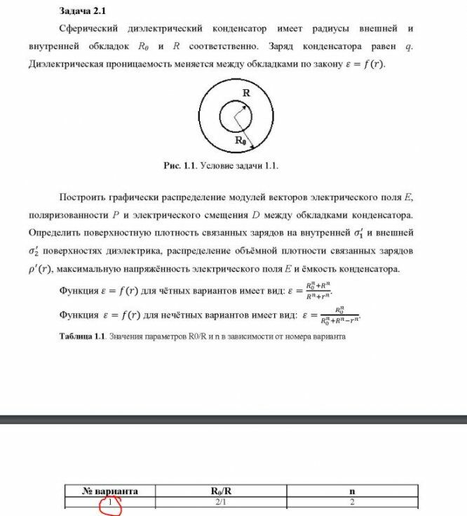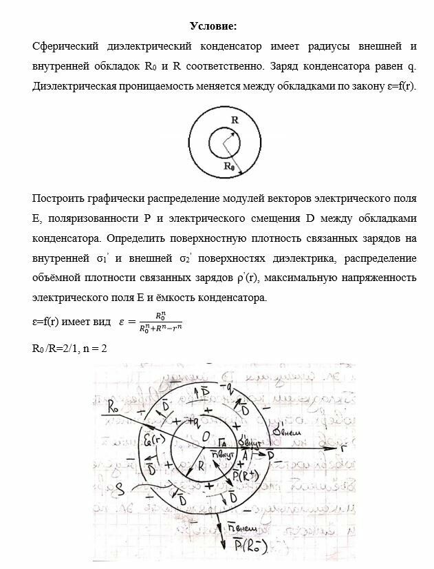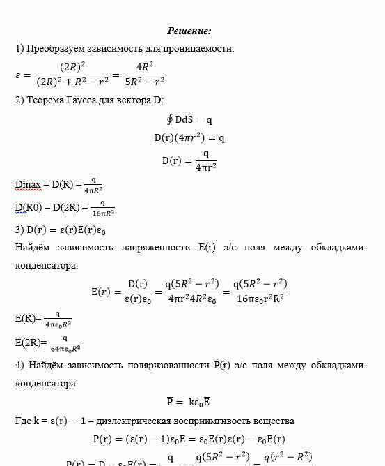 Построить графически распределение модулей векторов электрического поля Е, поляризованности Р и электрического смещения D между обкладками конденсатора. Определить поверхностную плотность связанных зарядов на внутренней σ1’ и внешней σ2’ поверхностях диэлектрика, распределение объёмной плотности связанных зарядов ρ’(r), максимальную напряженность электрического поля Е и ёмкость конденсатора.
