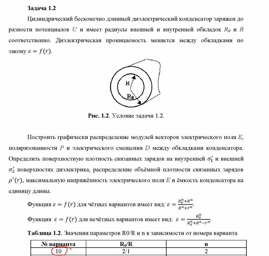 Построить графически распределение модулей векторов электрического поля Е, поляризованности Р и электрического смещения D между обкладками конденсатора. Определить поверхностную плотность связанных зарядов на внутренней s'1 и внешней s'2 поверхностях диэлектрика, распределение объёмной плотности связанных зарядов r’(r), максимальную напряжённость электрического поля Е и ёмкость конденсатора на единицу длины.