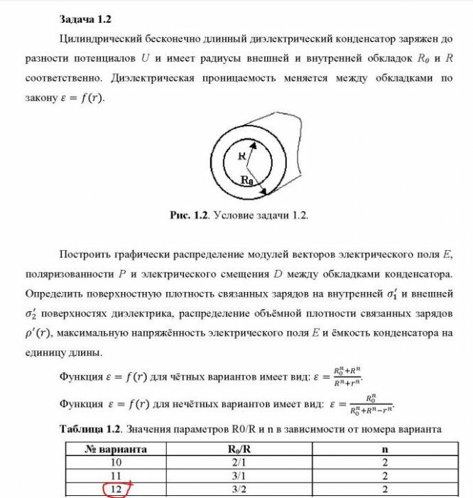 s'1 и внешней s'2 поверхностях диэлектрика, распределение объёмной плотности связанных зарядов r’(r), максимальную напряжённость электрического поля Е и ёмкость конденсатора на единицу длины.