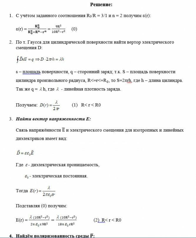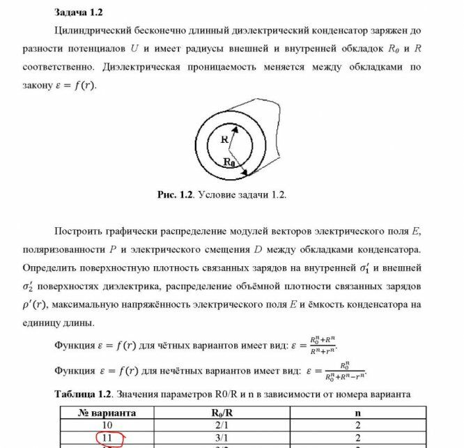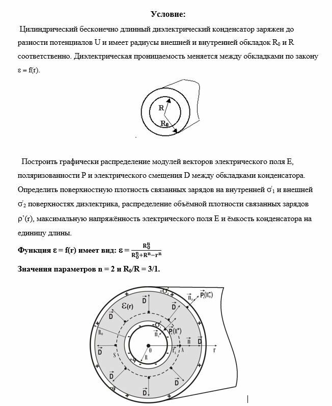 Построить графически распределение модулей векторов электрического поля Е, поляризованности Р и электрического смещения D между обкладками конденсатора. Определить поверхностную плотность связанных зарядов на внутренней s'1 и внешней s'2 поверхностях диэлектрика, распределение объёмной плотности связанных зарядов r’(r), максимальную напряжённость электрического поля Е и ёмкость конденсатора на единицу длины.