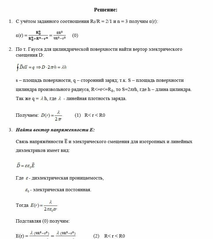 Цилиндрический бесконечно длинный диэлектрический конденсатор заряжен до разности потенциалов U и имеет радиусы внешней и внутренней обкладок R0 и R соответственно. Диэлектрическая проницаемость меняется между обкладками по закону e = f(r).