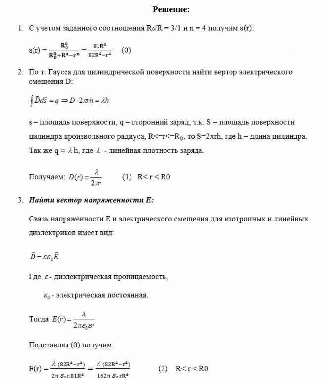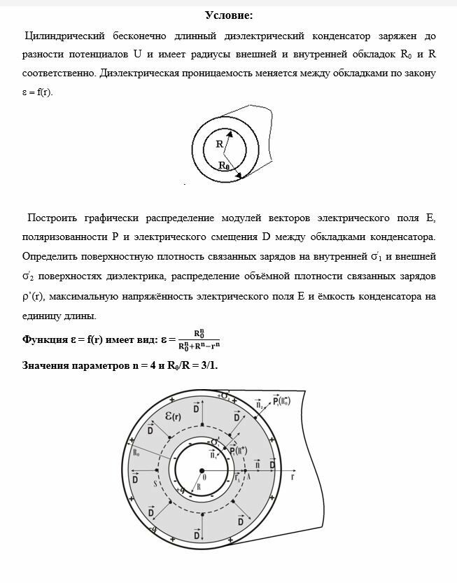 Построить графически распределение модулей векторов электрического поля Е, поляризованности Р и электрического смещения D между обкладками конденсатора. Определить поверхностную плотность связанных зарядов на внутренней s'1 и внешней s'2 поверхностях диэлектрика, распределение объёмной плотности связанных зарядов r’(r), максимальную напряжённость электрического поля Е и ёмкость конденсатора на единицу длины.