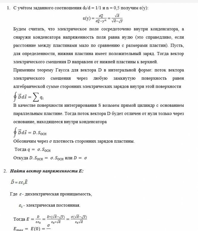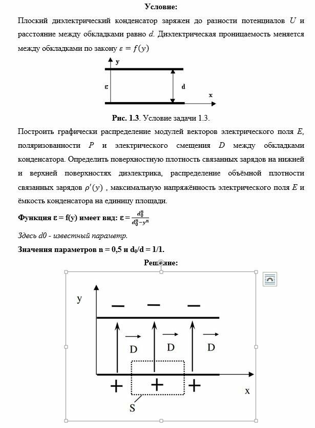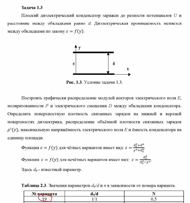 Построить графически распределение модулей векторов электрического поля Е, поляризованности Р и электрического смещения D между обкладками конденсатора. Определить поверхностную плотность связанных зарядов на нижней и верхней поверхностях диэлектрика, распределение объёмной плотности связанных зарядов , максимальную напряжённость электрического поля Е и ёмкость конденсатора на единицу площади.