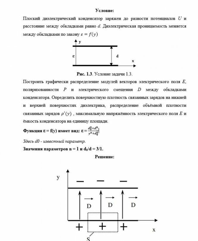 Построить графически распределение модулей векторов электрического поля Е, поляризованности Р и электрического смещения D между обкладками конденсатора. Определить поверхностную плотность связанных зарядов на нижней и верхней поверхностях диэлектрика, распределение объёмной плотности связанных зарядов , максимальную напряжённость электрического поля Е и ёмкость конденсатора на единицу площади.