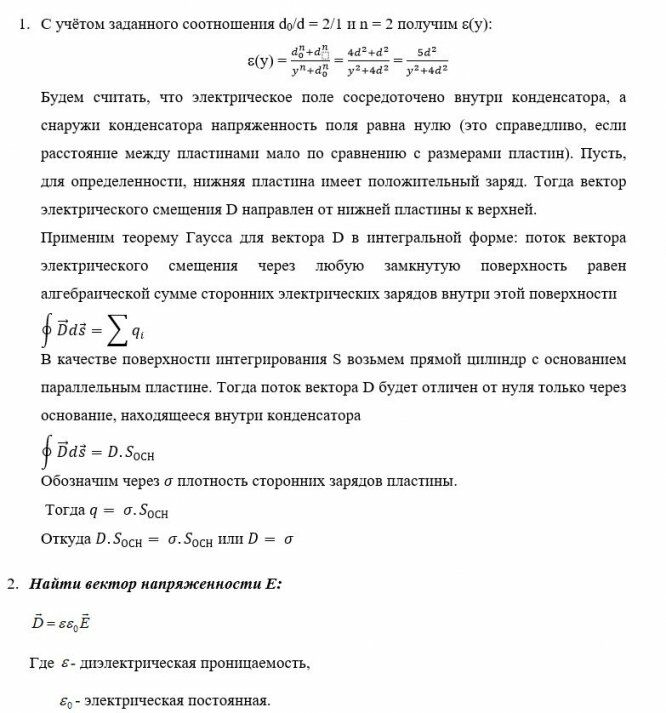 Построить графически распределение модулей векторов электрического поля Е, поляризованности Р и электрического смещения D между обкладками конденсатора. Определить поверхностную плотность связанных зарядов на нижней и верхней поверхностях диэлектрика, распределение объёмной плотности связанных зарядов , максимальную напряжённость электрического поля Е и ёмкость конденсатора на единицу площади.