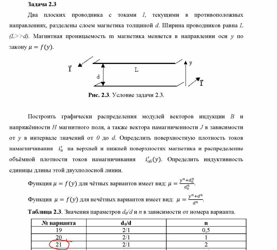 Построить графически распределения модулей векторов индукции B и напряжённости H магнитного поля, а также вектора намагниченности J в зависимости от у в интервале значений от 0 до d. Определить поверхностную плотность токов намагничивания на верхней и нижней поверхностях магнетика и распределение объёмной плотности токов намагничивания .Определить индуктивность единицы длины этой двухполосной линии.
