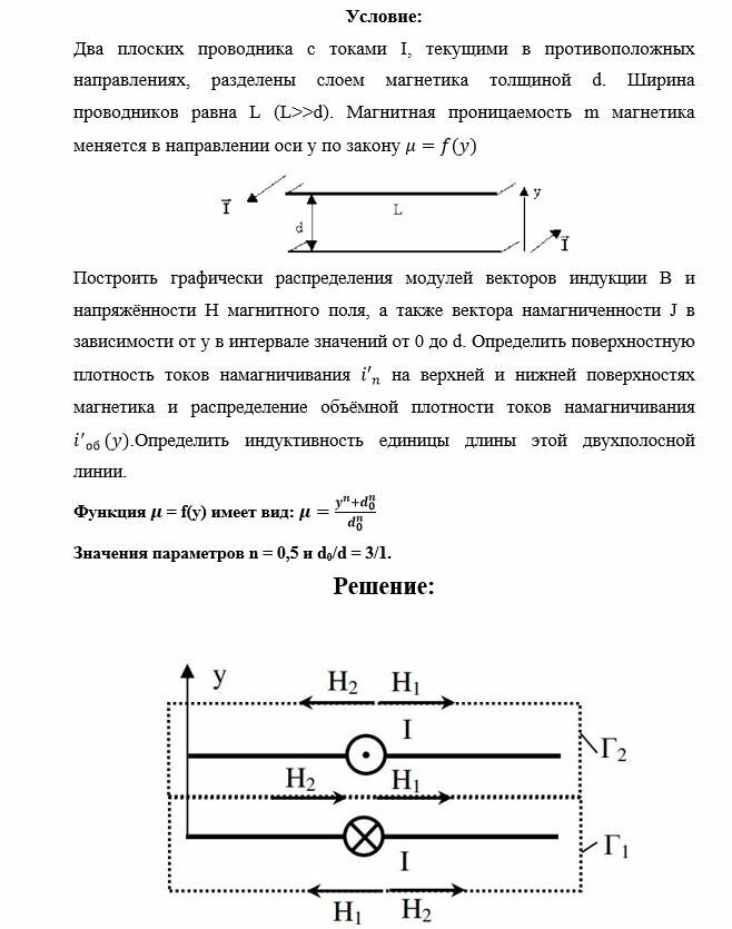 Построить графически распределения модулей векторов индукции B и напряжённости H магнитного поля, а также вектора намагниченности J в зависимости от у в интервале значений от 0 до d. Определить поверхностную плотность токов намагничивания на верхней и нижней поверхностях магнетика и распределение объёмной плотности токов намагничивания .Определить индуктивность единицы длины этой двухполосной линии.