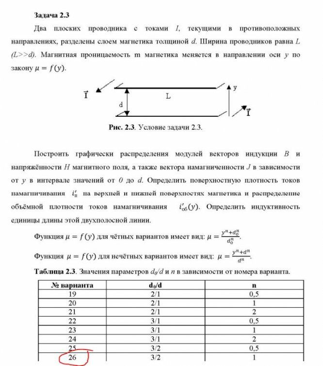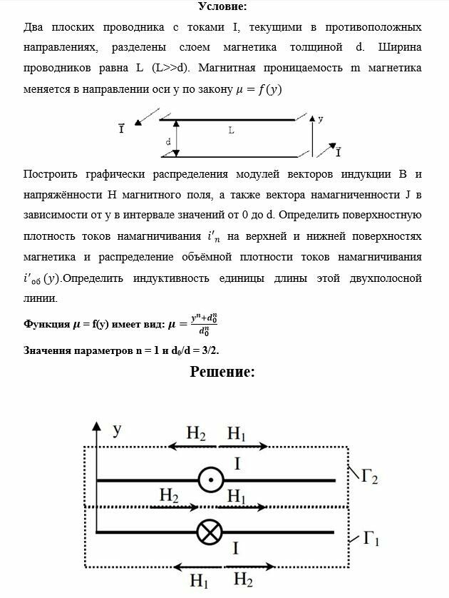 Построить графически распределения модулей векторов индукции B и напряжённости H магнитного поля, а также вектора намагниченности J в зависимости от у в интервале значений от 0 до d. Определить поверхностную плотность токов намагничивания на верхней и нижней поверхностях магнетика и распределение объёмной плотности токов намагничивания .Определить индуктивность единицы длины этой двухполосной линии.