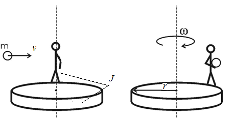 Главная » Учебные материалы » Физика » Решения задач » Несколько классов/семестров » На неподвижной скамье Жуковского стоит человек и ловит рукой мяч массой 1,7 кг, который летит горизонтально со скоростью 9,6м/с. С какой угловой скоростью ω будет вращаться скамья с человеком, поймавшим мяч? Расстояние мяча от оси вращения скамьи 9,2