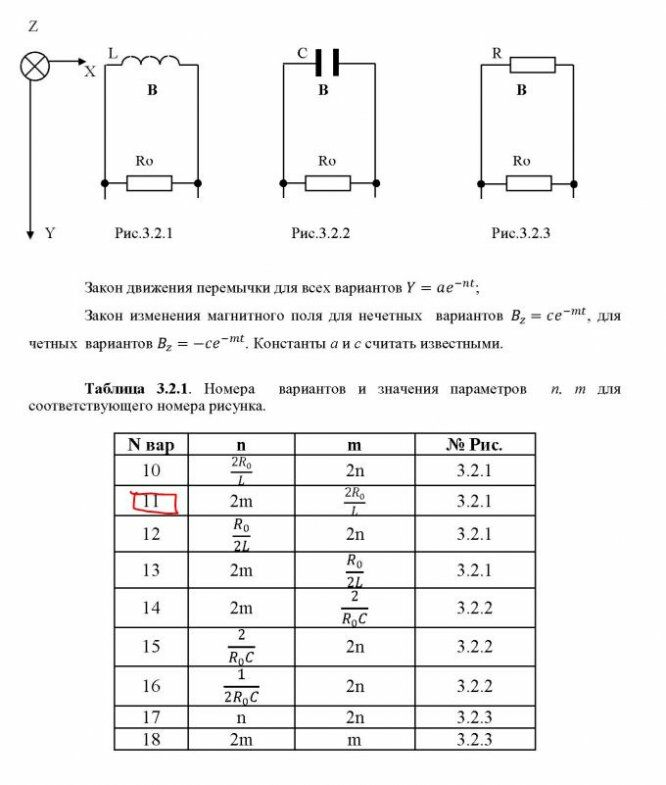 По двум гладким медным шинам скользит перемычка массы M, закон движения которой задан Y = f(t). Сопротивление перемычки равно , поперечное сечение S, концентрация носителей заряда (электронов) в проводнике перемычки равна . Сверху шины замкнуты электрической цепью, состоящей из конденсатора ёмкости С. Расстояние между шинами l. Система находится в однородном переменном магнитном поле с индукцией B(t), перпендикулярном плоскости, в которой перемещается перемычка. Сопротивление шин, скользящих контактов, а также самоиндукция контура пренебрежимо малы. Ток через конденсатор в начальный момент времени равен 0.