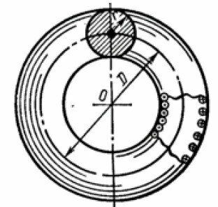 На рисунке показан тороид, не содержащий сердечник. Диаметр тороида по средней линии D=30 см, а радиус его сечения r=30 см, число витков N=2000. По обмотке течёт ток I=0,5 А. Пользуясь законом полного тока, определить минимальное значение магнитной индукции в тороиде.