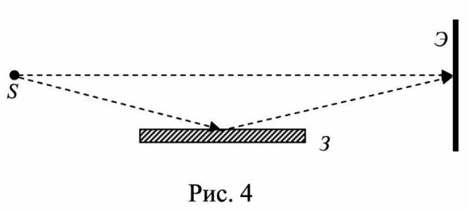 Интерференционная картина на экране Э образуется при сложении световой волны, исходящей от когерентного источника S в виде тонкой нити, и волны, отраженной от плоского зеркала З (рис. 4). Расстояние L = 1 м от источника до экрана значительно превышае