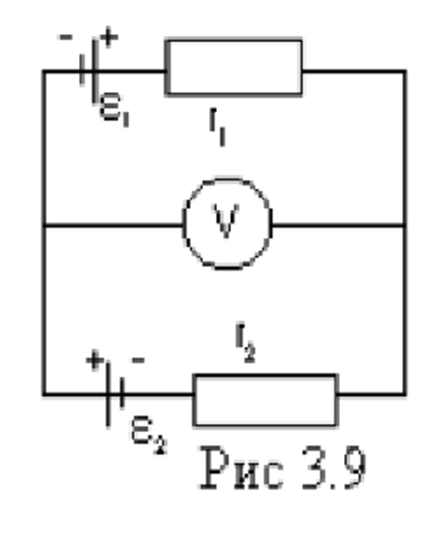 Главная » Учебные материалы » Физика » Решения задач » Несколько классов/семестров » Элементы цепи, схема которой изображена на рис. 3.9, имеют следующие значения: e1 = 2 В, e2 = 3 В, R1 = 3 кОм, R2 = 2 кОм. Определить показание вольтметра, если его внутреннее сопротивление 5 кОм. Внутренними сопротивлениями источников тока пренебреч