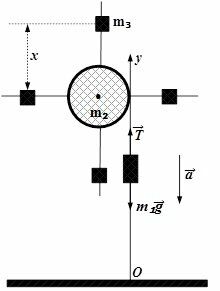 На однородный цилиндрический блок массой m2 и радиусом R намотана невесомая нить, к свободному концу которой прикреплен груз массой m1. К блоку крестообразно прикреплены четыре одинаковых невесомых стержня, на которых закреплены одинаковые грузы массой m3 на расстоянии x от оси вращения (Рис.2). Грузы m3 можно считать материальными точками. Трением в блоке можно пренебречь. Найти зависимость ускорения a груза m1 от расстояния x . Построить график этой зависимости в интервале изменения x от R до 3R. Ускорение свободного падения g = 9.81 м/ с2.